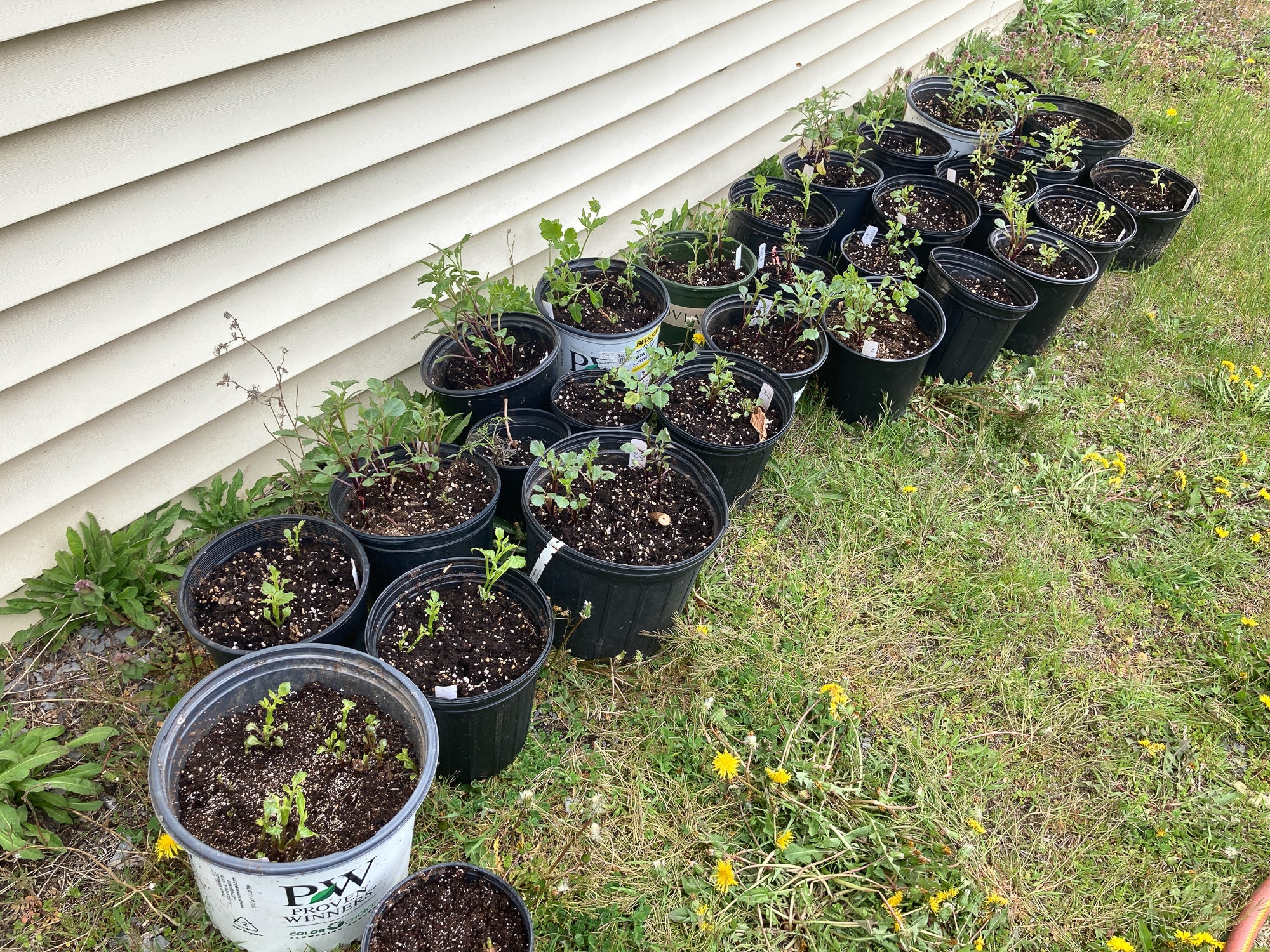 Spring of 2021 arrived with us excited to try MORE dahlias. Leto suggested we try growing some from seed. We started a couple trays of seeds and planted them out with the tubers from the previous year. The new seedlings looked very different! To give the tubers a head-start on the season, we potted them up before the last frost.