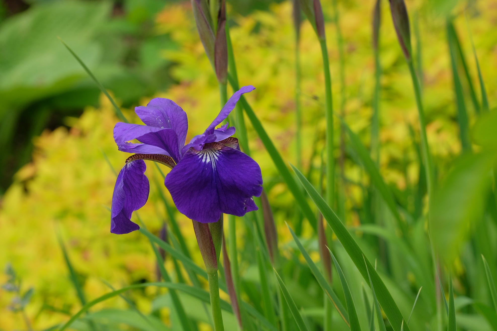 Back in the 1970’s there wasn’t a ton of options when it came to Siberian irises. You had primarily dark purples like this, or a few wine-colored ones. Occasional whites were available, but they were pretty meh. In 1976, Currier McEwen introduced ‘Butter and Sugar’ which was the first yellow (and white) Siberian iris. (Eons ago, a friend gave us a small clump of Butter and Sugar, but the guy mowing our lawn managed to cut it to the ground at the worst possible time.)